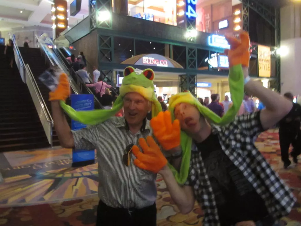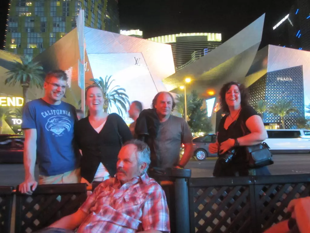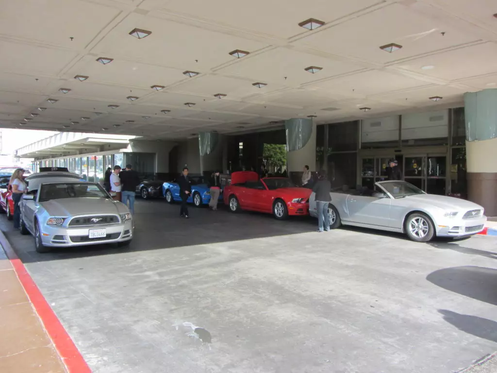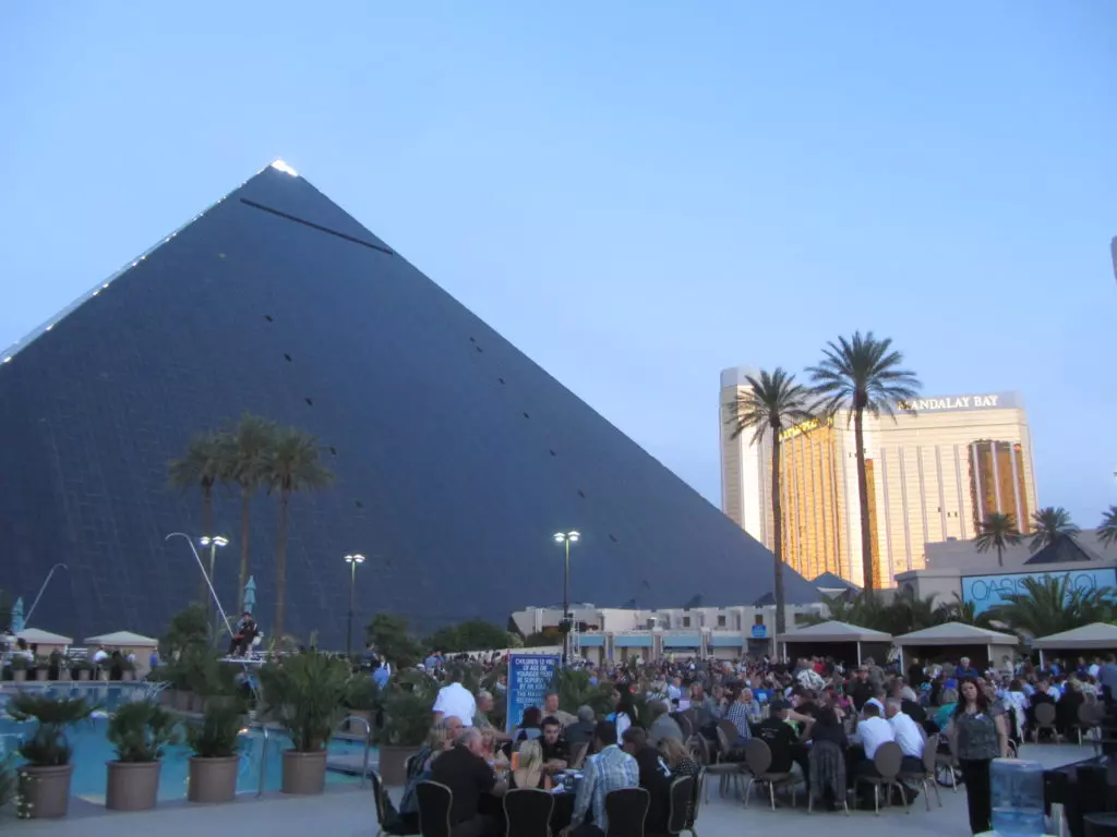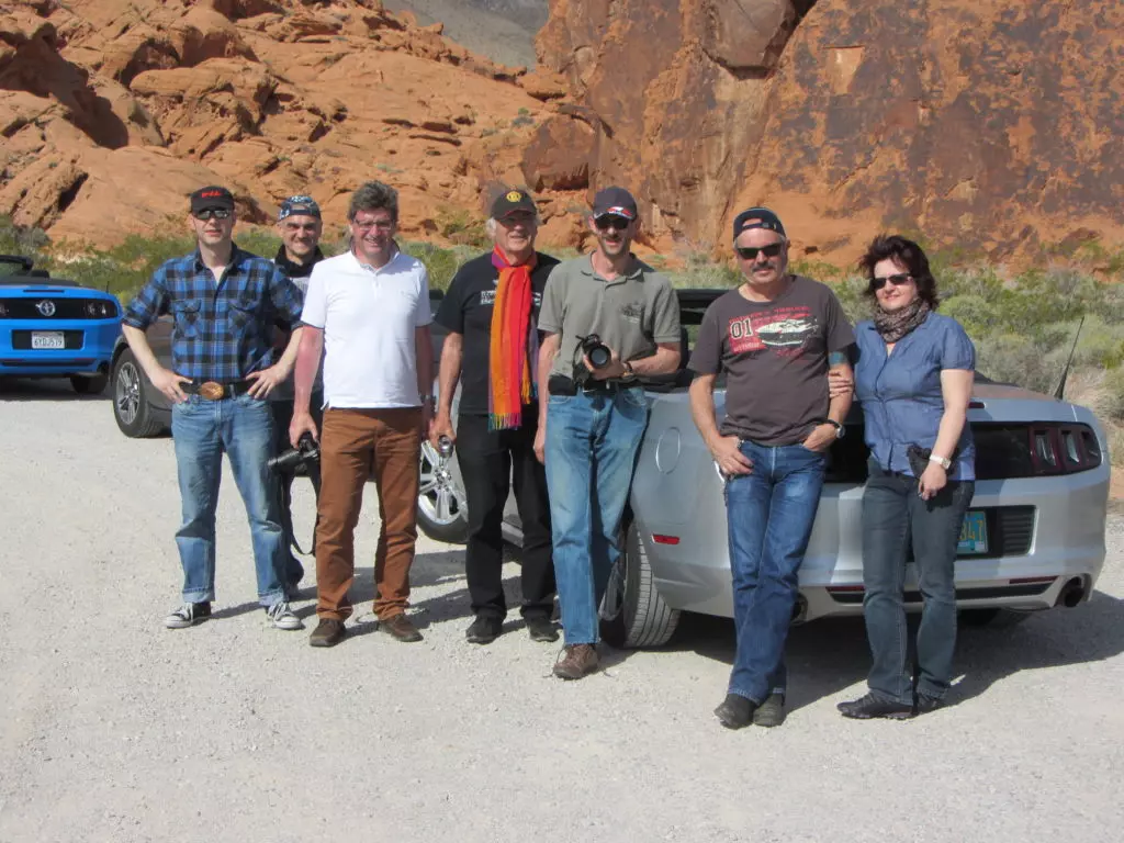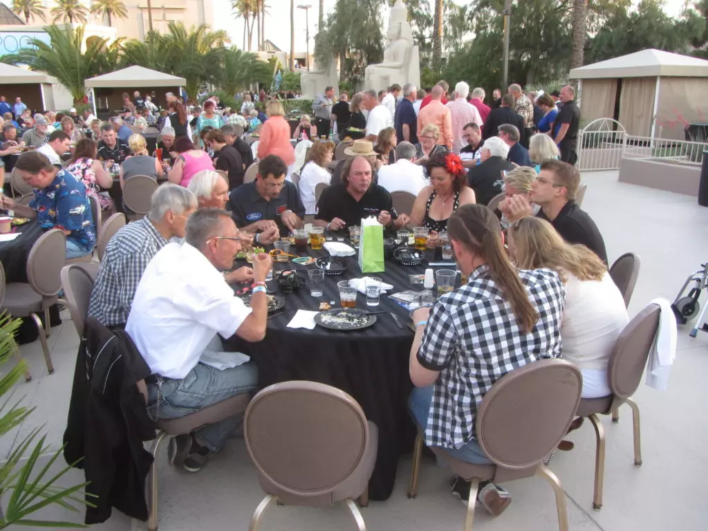 Das Abendprogramm das relativ langweilig begann dauerte dann doch bis spät in die Nacht. Wir waren eingeladen an die Ford-Gala im Outdoor Poolbereich des Hotel Luxor. Rund 1000 Personen fanden sich da ein. Das Gala-Essen, obwohl aus Plastikgeschirr (das geht hier!) war hervorragend, danach kamen Ansprachen der ganzen Ford Prominenz vom aktuellen CEO, Chef-Ingenieuren sowie weiteren Persönlichkeiten.Wiedermal versagte die Technik, na ja wir sassen gar arg weit weg vom Speakerpult. Der Highligt des Abends begann aber erst als der Grossteil der Leute bereits gegangen war, als wir mit Walter dem Ex-Ford Mitarbeiter aus Detroit zur Ford Prominenz gestossen sind. Walter machte es möglich, dass wir den Shelby Enkel (Aaron Shelby), die Enkelin vom Lee Iacooca (Molly Hentz), die Sprecherin vom Lee Iacocca (Norma Saken) und weitere Ford-Leute persönlich kennenlernten und mit Pins, Autogrammen und Fotos beglückt wurden. Vorgestellt haben wir uns jeweils als Vertreter des MCS was sehr gut ankam und auch Walters Vergangenheit interessierte sehr, wirklich nette Leute ohne Allüren (typisch Amerikanisch).