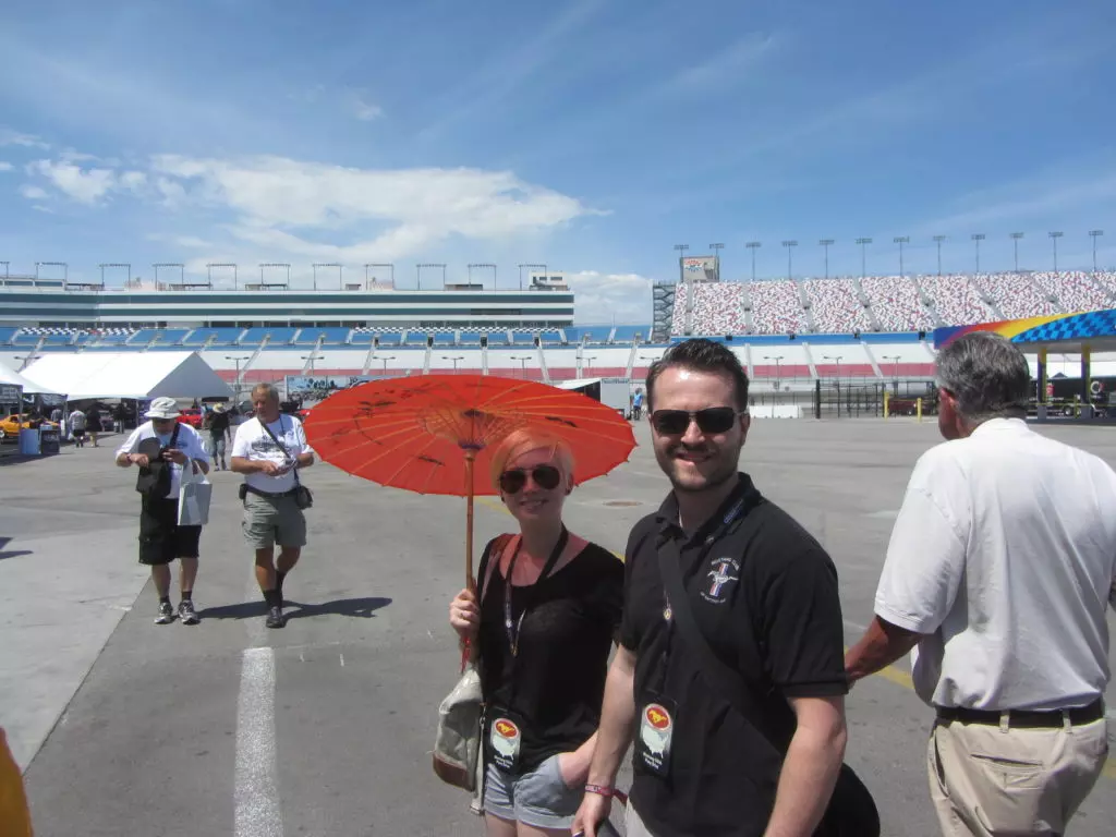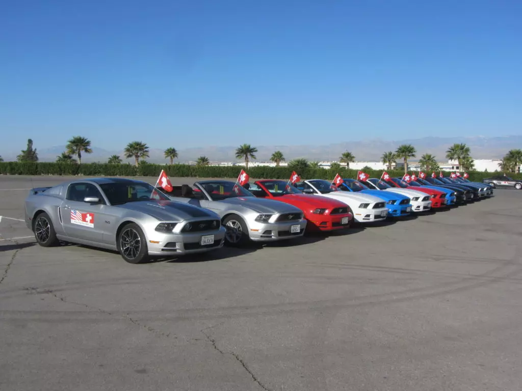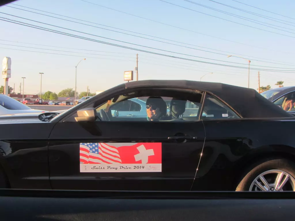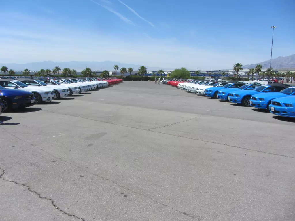 Das mit dem verspäteten Eintreffen auf dem Speedway hat sich als optimal heraugestellt, da unsere Kollegen so wie die meisten Mustangfahrer blockiert waren mit der Einfahrt durch einen Halbmarathon der gleichzeitig am Speedway durchgeführt wurde. Ja richtig gelesen, der amerikanische Mustang Club hatte einen Halbmarathon für Läufer organisiert, da waren einige 10’000 Leute die blockierten alles und von Autos hatten diese keine Ahnung! Die Läufer und Besucher des Marathons hätte alle Einlass gehabt zum Geburtstagsevent. Die Verkehrposten konnten nicht mal Mustangs von den normalen Autos unterscheiden! Chaos pur. Aber bis wir da waren hatte sich der Spuk gelegt, wir fuhren ohne Probleme auf unseren VIP Parkplatz.
